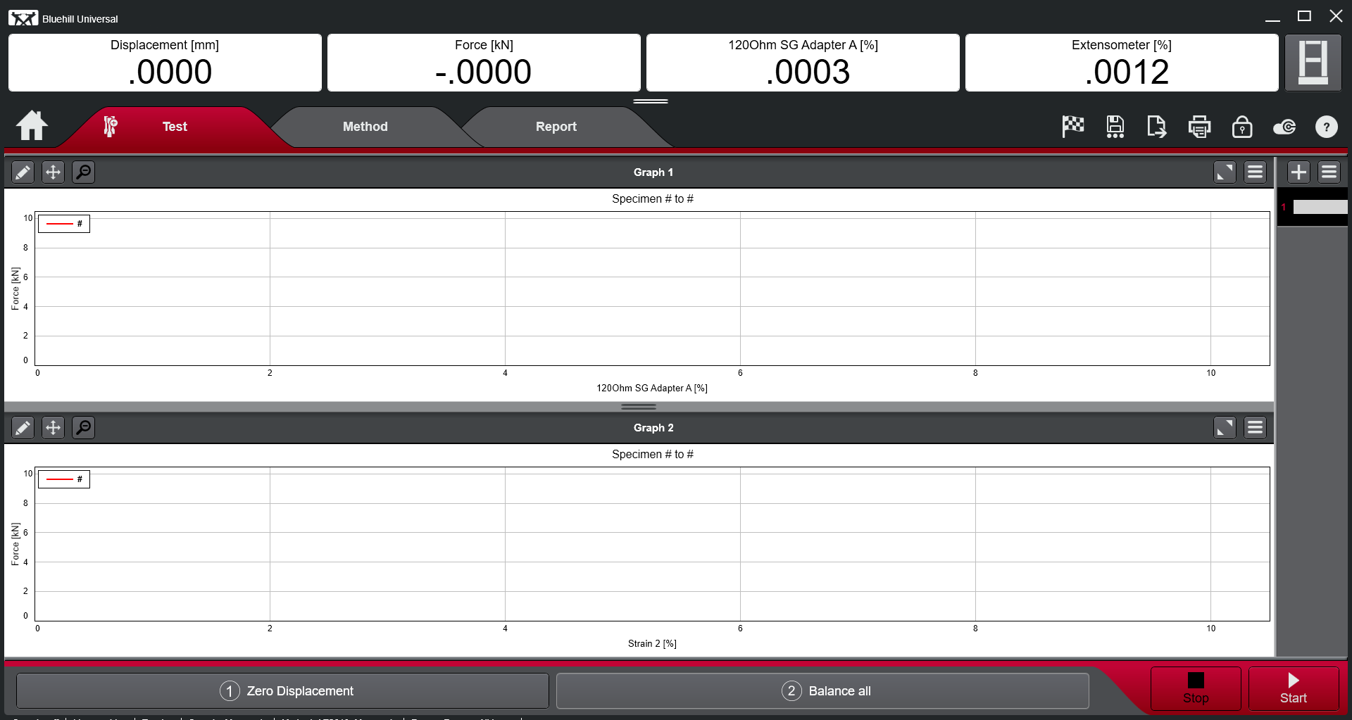 2. On the bottom of the screen, click `Balance All` and `Zero Displacement`- this zeroes all values. Observe the 4 live readings at the top of the screen to ensure everything is essentially zero.